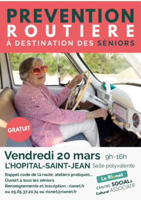 Prévention routière, vendredi 20 mars de 9h à 16h à la salle polyvalente de l'Hôpital-Saint-Jean : des rappels clairs et ludiques du Code de la route, des conseils pratiques pour conduire en toute sécurité et en toute confiance, des ateliers pratiques sur la sécurité routière. Gratuit, sur inscription