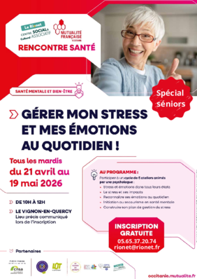 Stress et émotions, 5 ateliers à partir du mardi 21 avril de 10h à 12h à la salle polyvalente des Quatre-Routes-du-Lot : à tout âge, nos émotions sont précieuses : des joies, des souvenirs… Mais la vie peut aussi apporter son lot de stress, d’anxiété et d’émotions parfois difficiles à gérer. Bonne nouvelle, il existe des moyens concrets pour surmonter les défis émotionnels et retrouver plus de sérénité au quotidien. Gratuit, financé par la Conférence des Financeurs de la Prévention de la Perte d’Autonomie en partenariat avec la Mutualité Française d’Occitanie. Sur inscription.